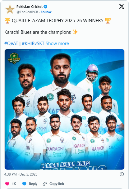 The result closes a highly competitive domestic season and reinforces Karachi Blues’ position as one of the most successful and stable sides in Pakistan’s first-class structure.